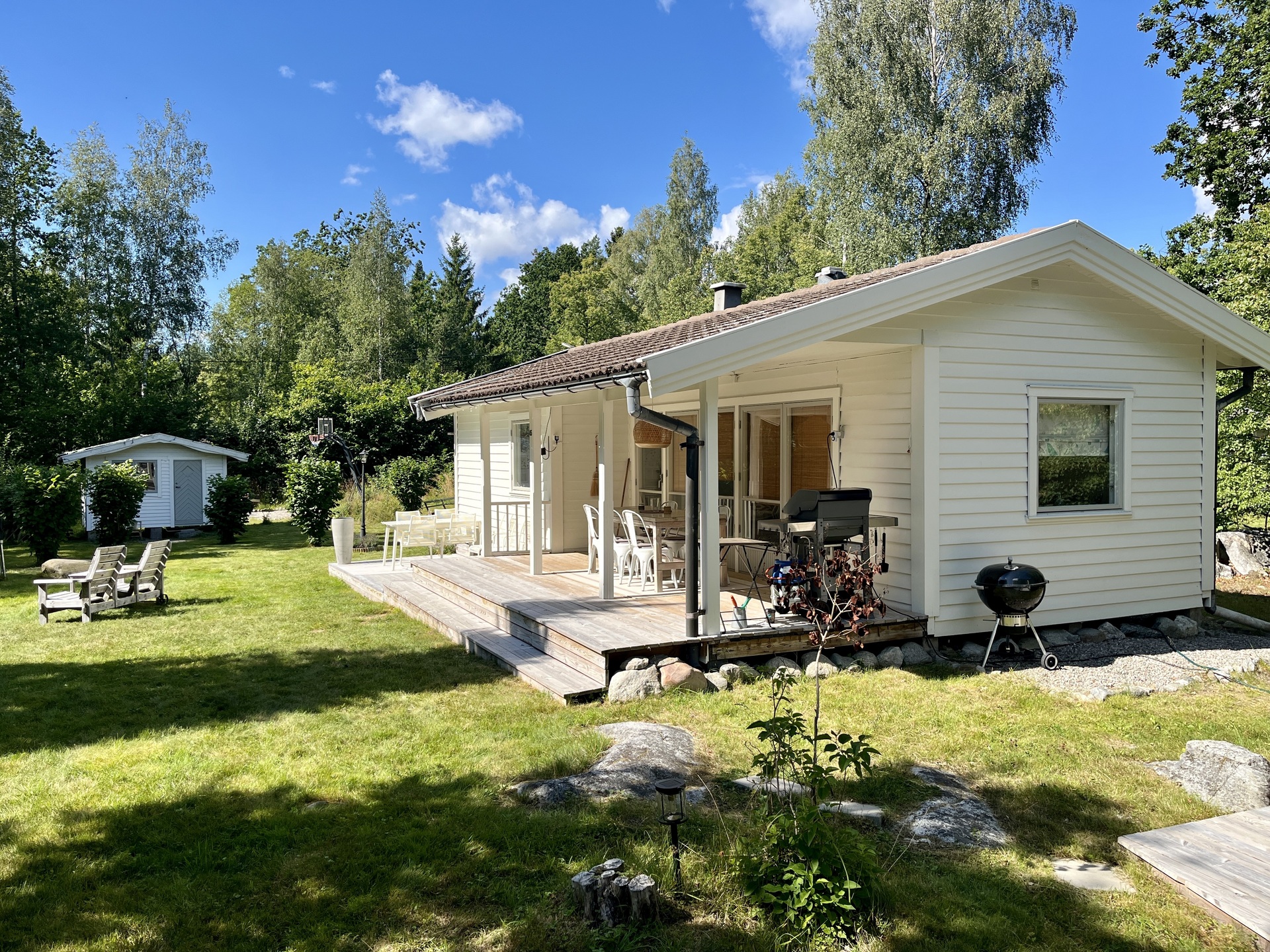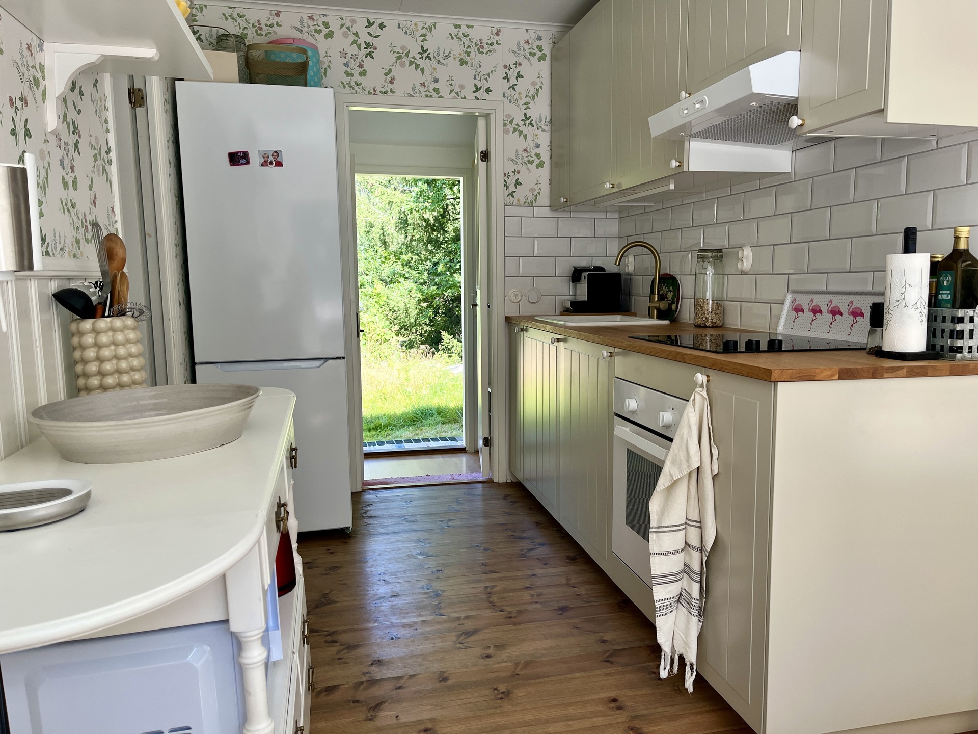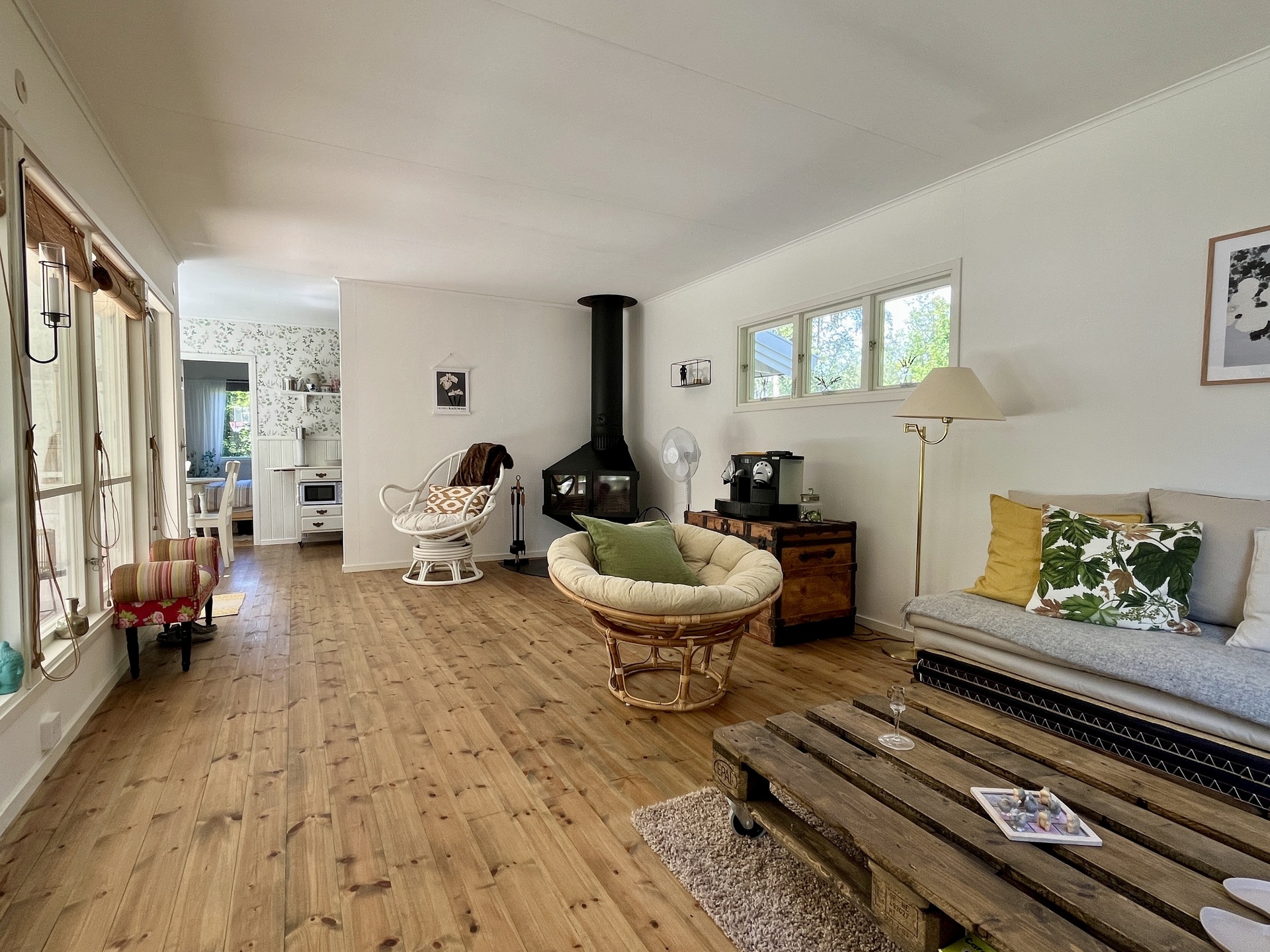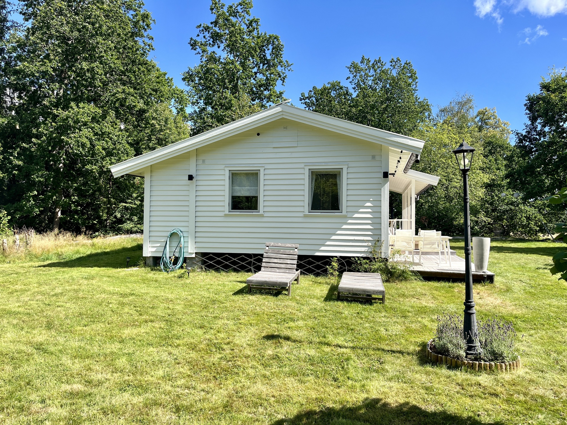 Entré Hall med praktisk kapphängare, laminatgolv. På utsidan till höger om entrén, finns ett mindre förråd med vv-beredare. Till vänster om entrén finns ett praktiskt vedförråd. Badrum Badrum med fönster, duschhörna, separett, tvättställ med spegelskåp ovan, samt förvaring under, stilren klinker på golvet. Kök Köket är utrustat med spishäll, ugn, fläkt, kombinerad kyl/frys. Bra förvaringsmöjligheter, och kakel ovan bänkskiva av ek. Matplats för fyra personer, vacker bröstpanel samt ett fint trägolv. Sovrum 1 Sovrum med en våningssäng, samt en vanlig säng, två garderober, laminatgolv. Sovrum 2 Sovrum med plats för dubbelsäng, två garderober, laminatgolv. Vardagsrum Stort vardagsrum som har ett fantastiskt ljusinsläpp, en trivsam braskamin med inbyggd fläkt, vackert trägolv, och utgång till den härliga altanen i söderläge. Renoveringar 2022- Målning och tapetsering i samtliga rum, samt utvändig ommålning av huset. Uppfört vedeldad bastu, badtunna med bubbelfunkiton, utedusch samt tillhörande trädäck vid bastu och badtunna. 2021- Nytt kök och nya vitvaror. Nytt furugolv (hårdvaxoljat) i köket och vardagsrummet. Badrummet har fått ny kommod, ny Separett (9000) samt våtrumsmålat väggar och tak, nytt klinkergolv. Ny varmvattenberedare. Solcellsstyrd lyktstolpe mellan husen.