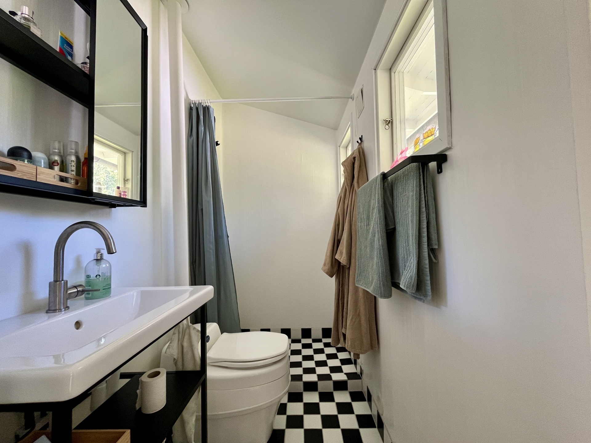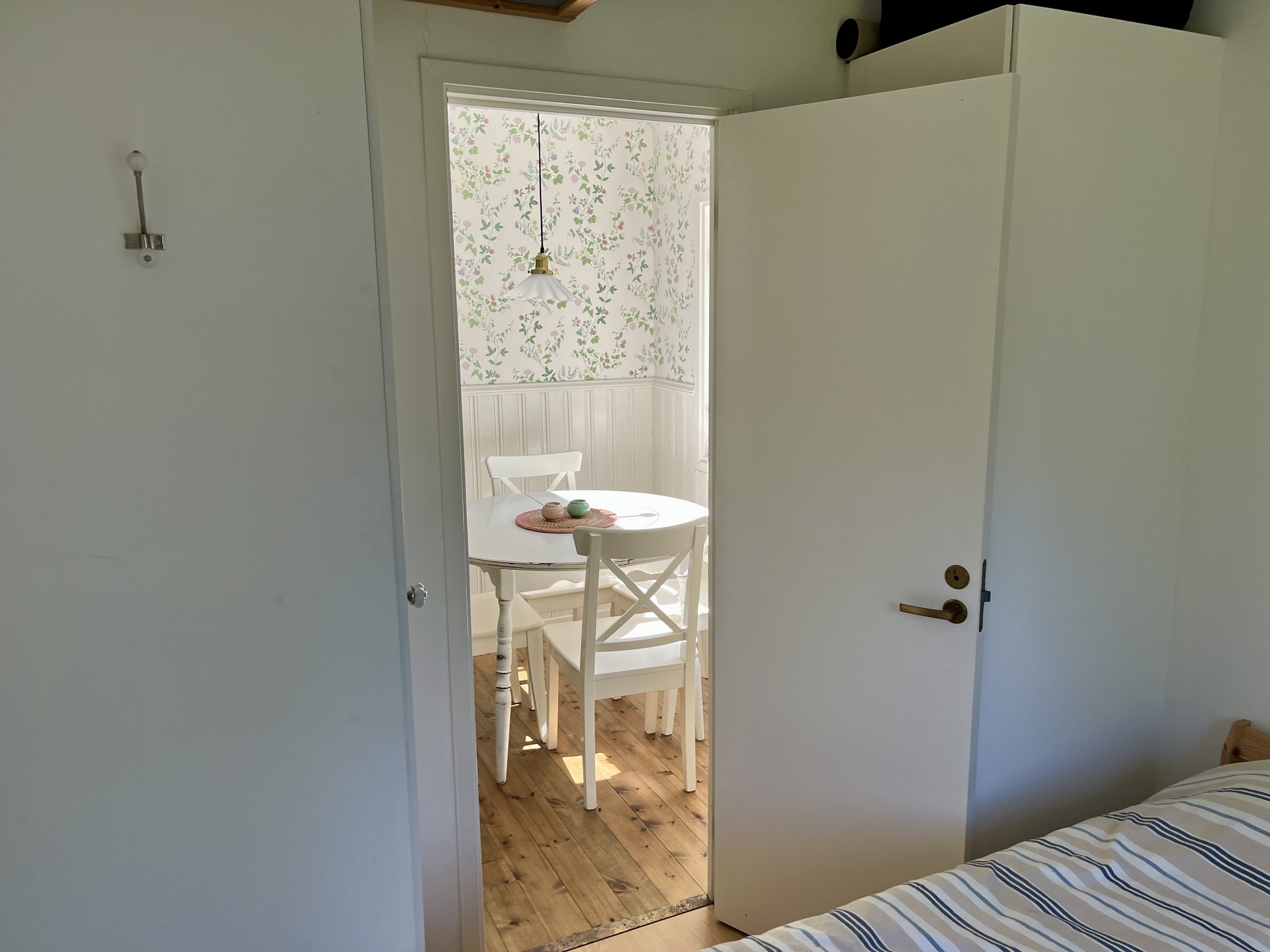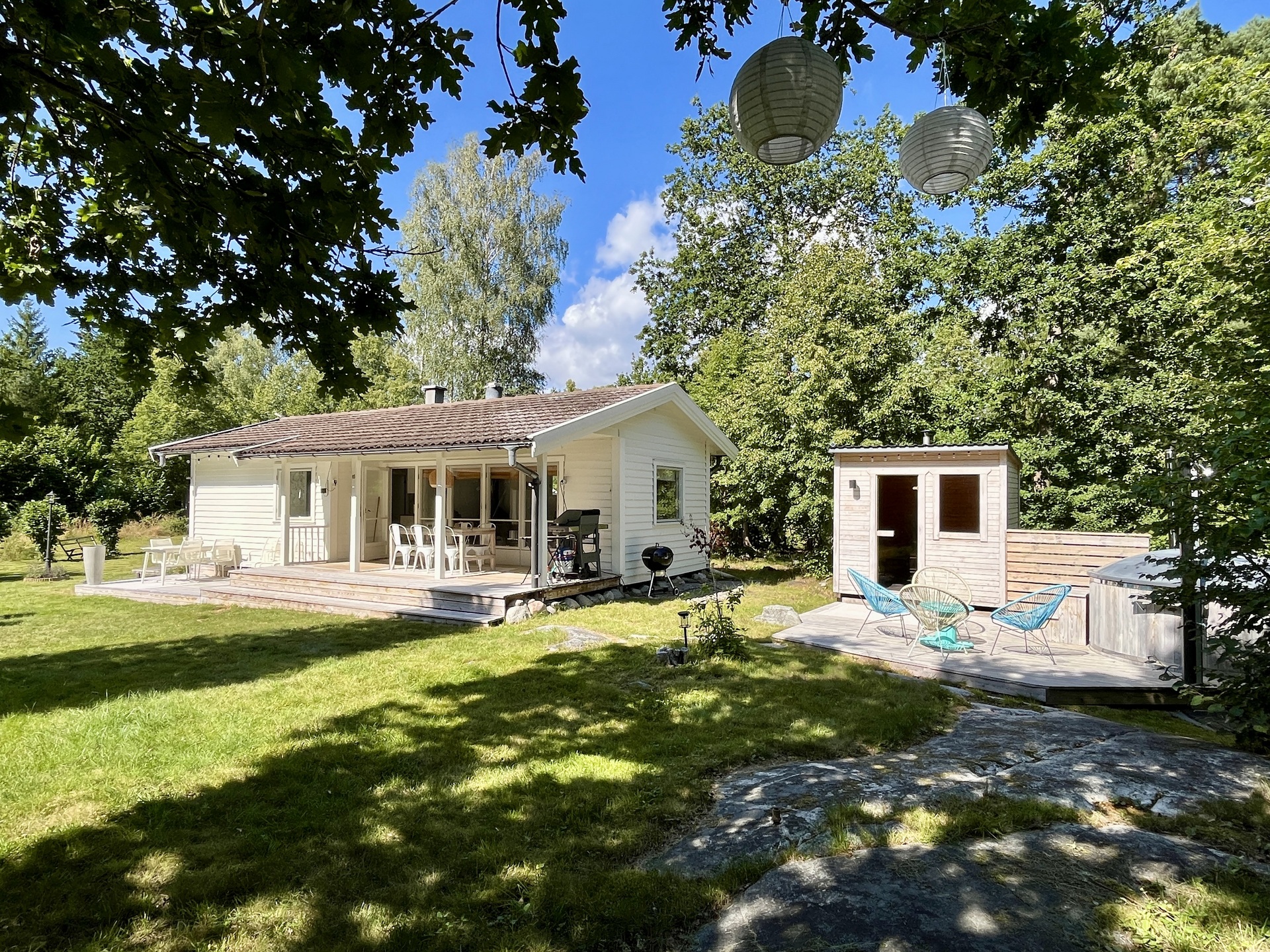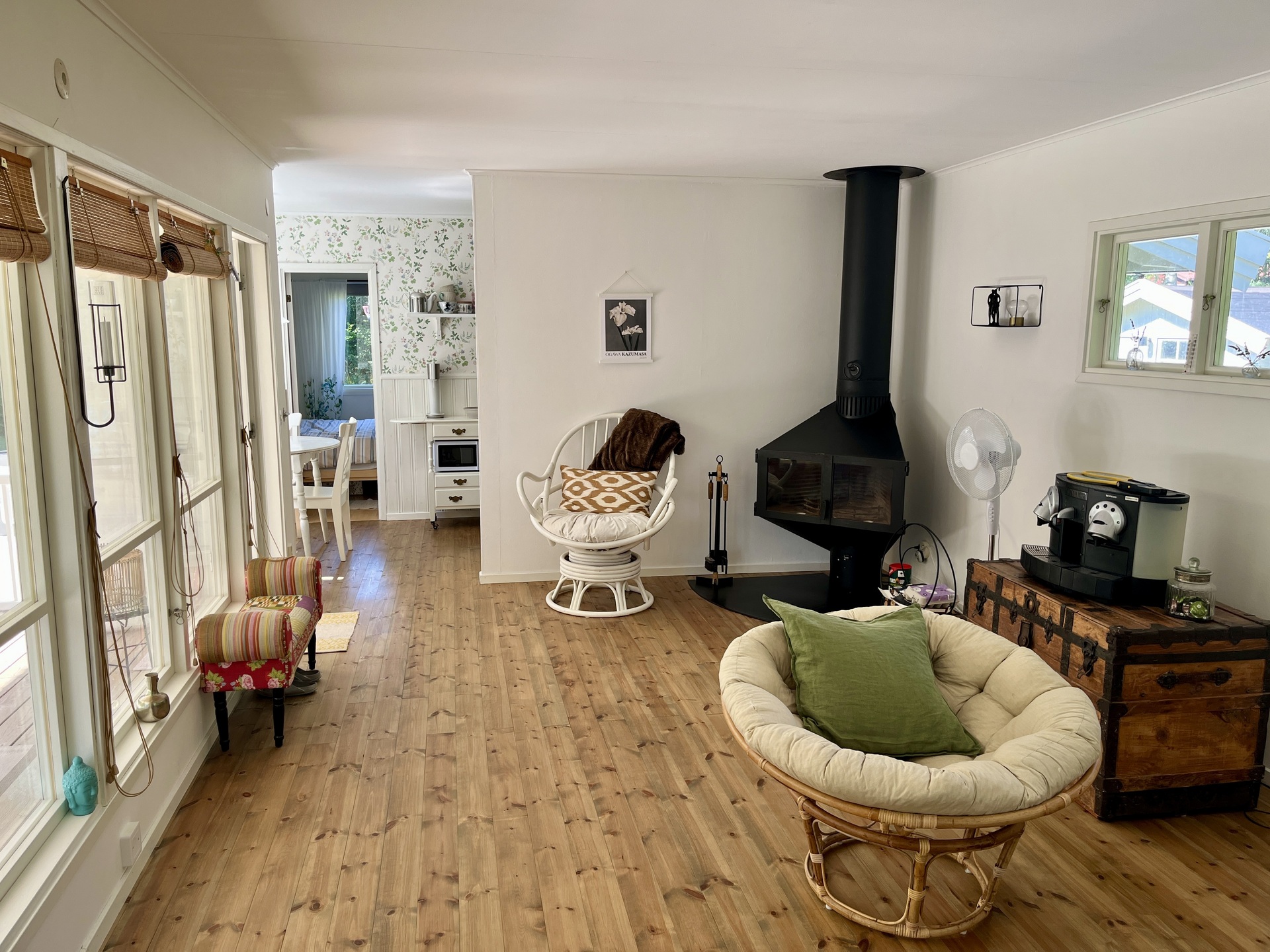 Entré Hall med praktisk kapphängare, laminatgolv. På utsidan till höger om entrén, finns ett mindre förråd med vv-beredare. Till vänster om entrén finns ett praktiskt vedförråd. Badrum Badrum med fönster, duschhörna, separett, tvättställ med spegelskåp ovan, samt förvaring under, stilren klinker på golvet. Kök Köket är utrustat med spishäll, ugn, fläkt, kombinerad kyl/frys. Bra förvaringsmöjligheter, och kakel ovan bänkskiva av ek. Matplats för fyra personer, vacker bröstpanel samt ett fint trägolv. Sovrum 1 Sovrum med en våningssäng, samt en vanlig säng, två garderober, laminatgolv. Sovrum 2 Sovrum med plats för dubbelsäng, två garderober, laminatgolv. Vardagsrum Stort vardagsrum som har ett fantastiskt ljusinsläpp, en trivsam braskamin med inbyggd fläkt, vackert trägolv, och utgång till den härliga altanen i söderläge. Renoveringar 2022- Målning och tapetsering i samtliga rum, samt utvändig ommålning av huset. Uppfört vedeldad bastu, badtunna med bubbelfunkiton, utedusch samt tillhörande trädäck vid bastu och badtunna. 2021- Nytt kök och nya vitvaror. Nytt furugolv (hårdvaxoljat) i köket och vardagsrummet. Badrummet har fått ny kommod, ny Separett (9000) samt våtrumsmålat väggar och tak, nytt klinkergolv. Ny varmvattenberedare. Solcellsstyrd lyktstolpe mellan husen.