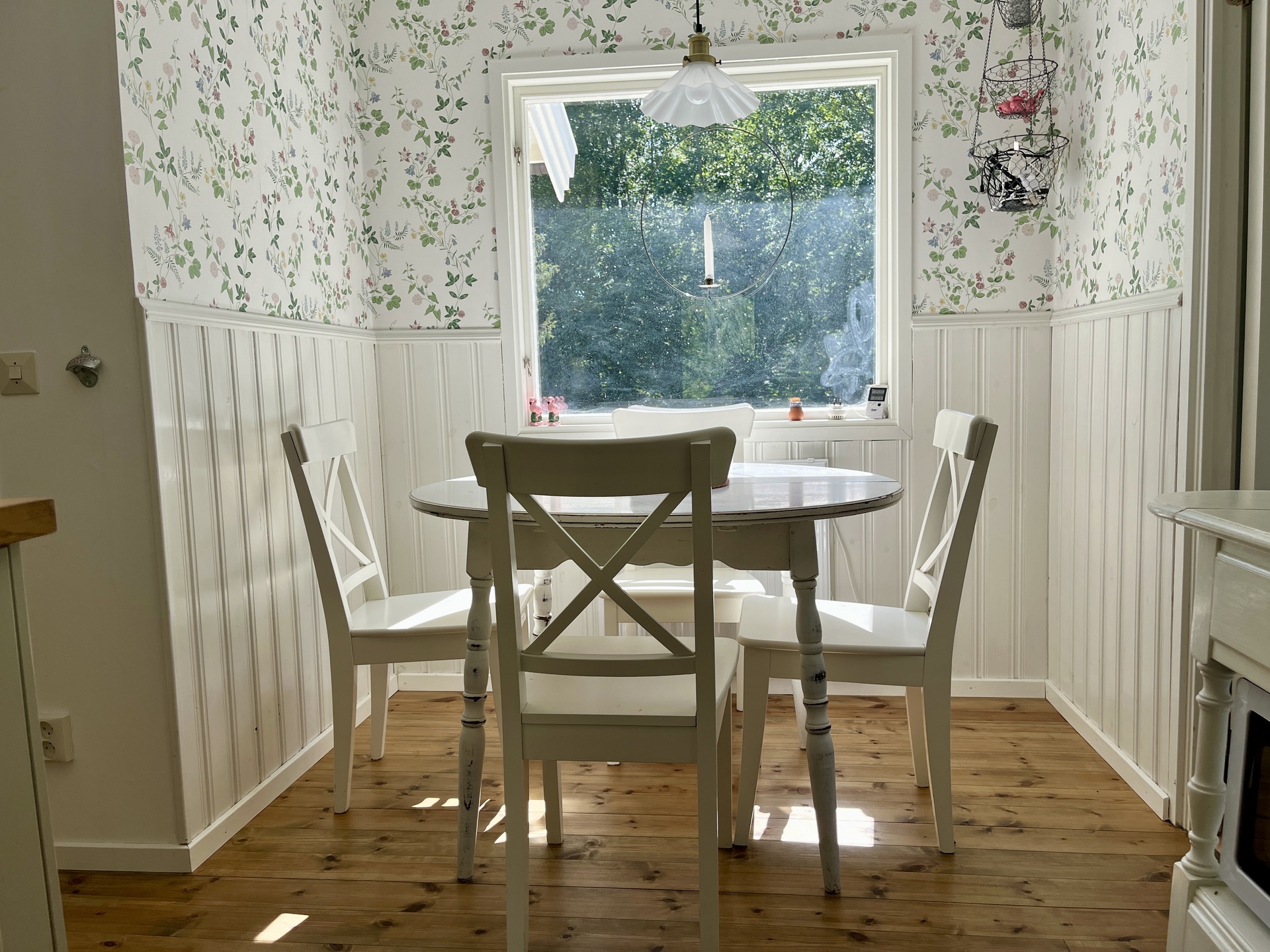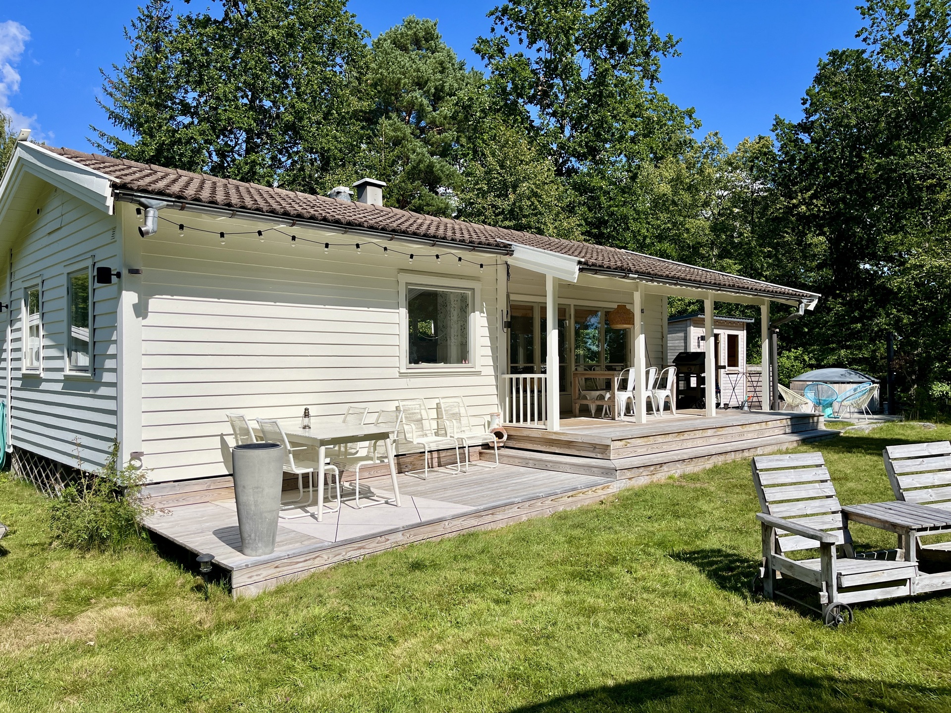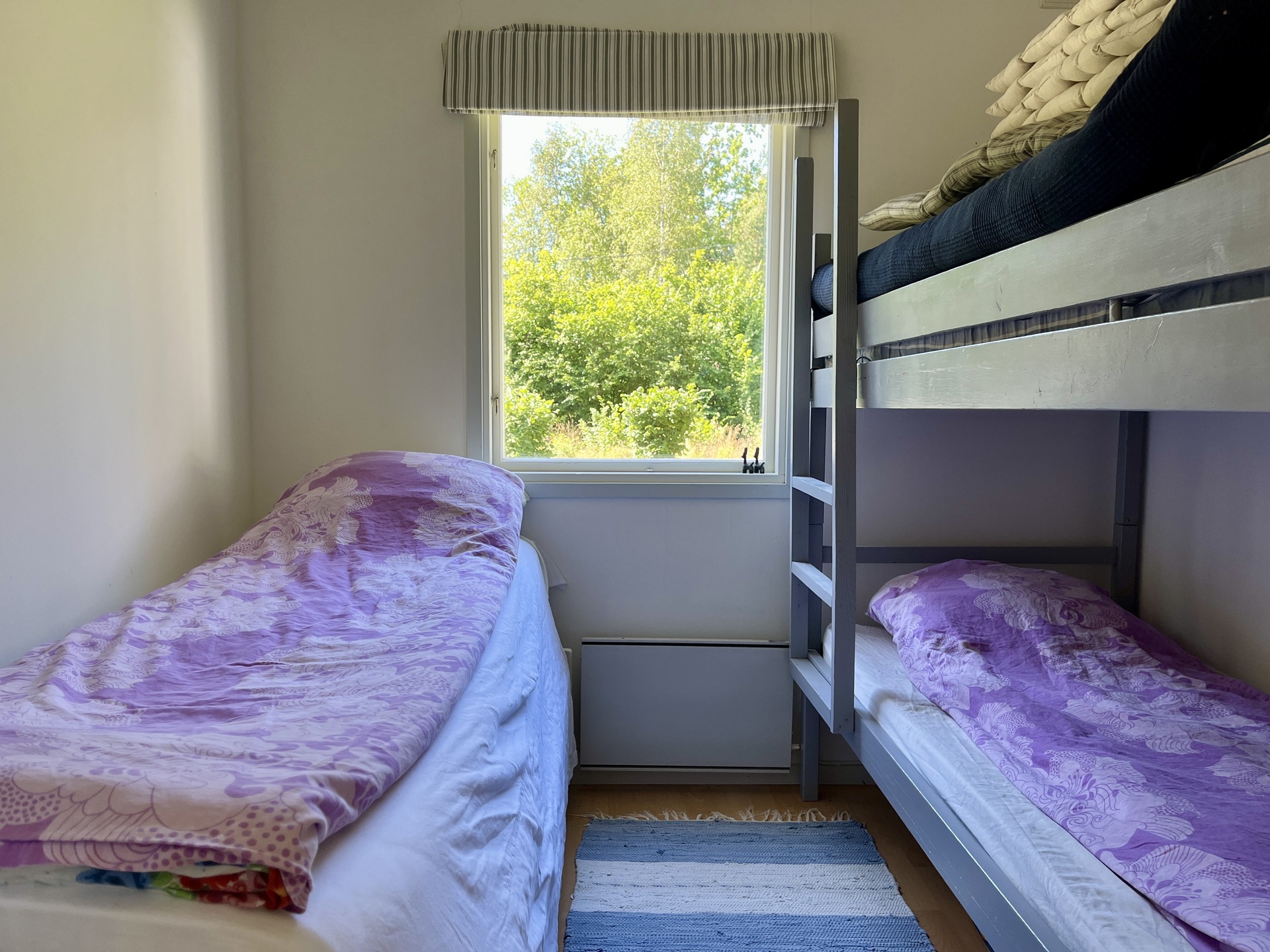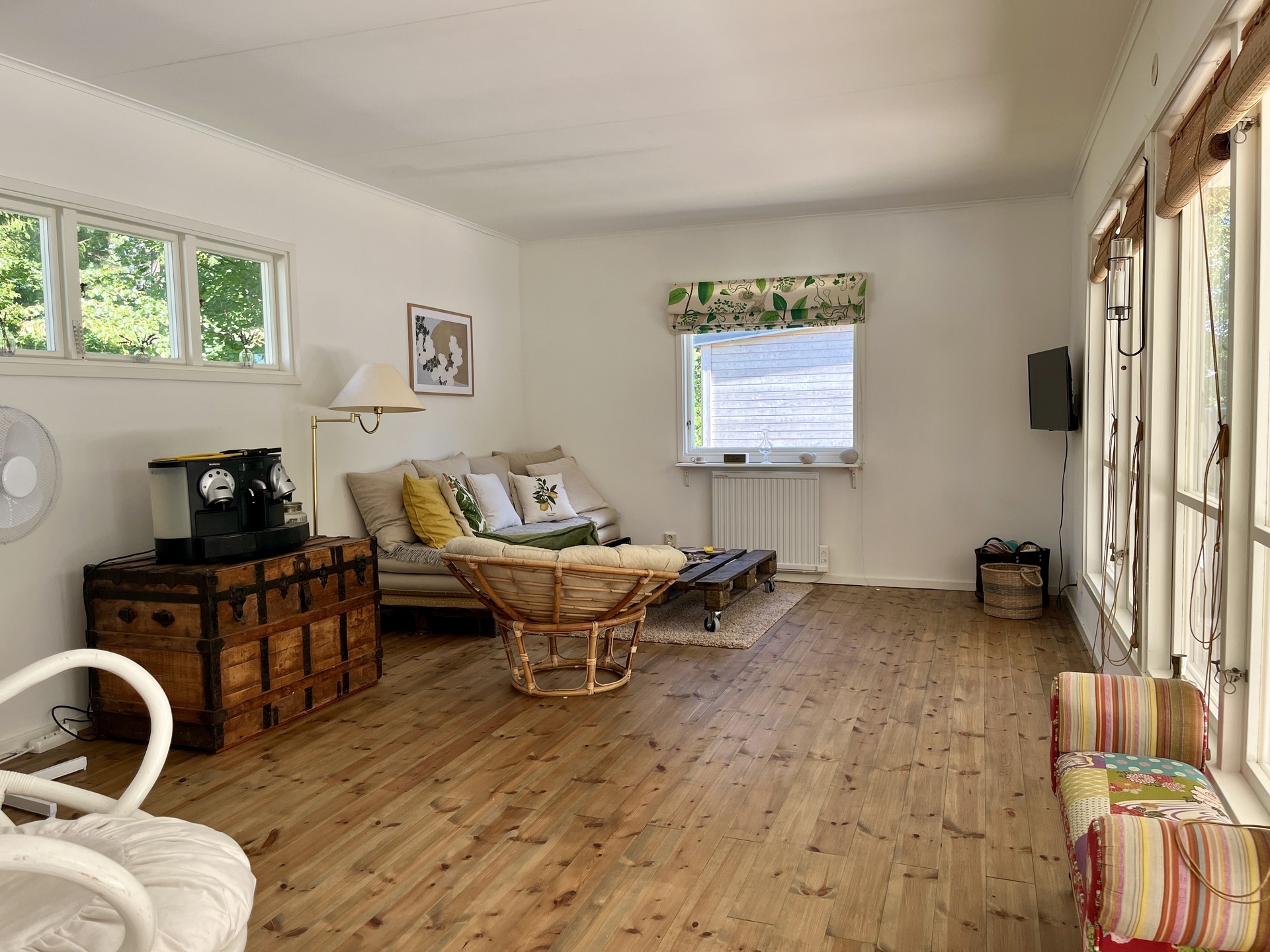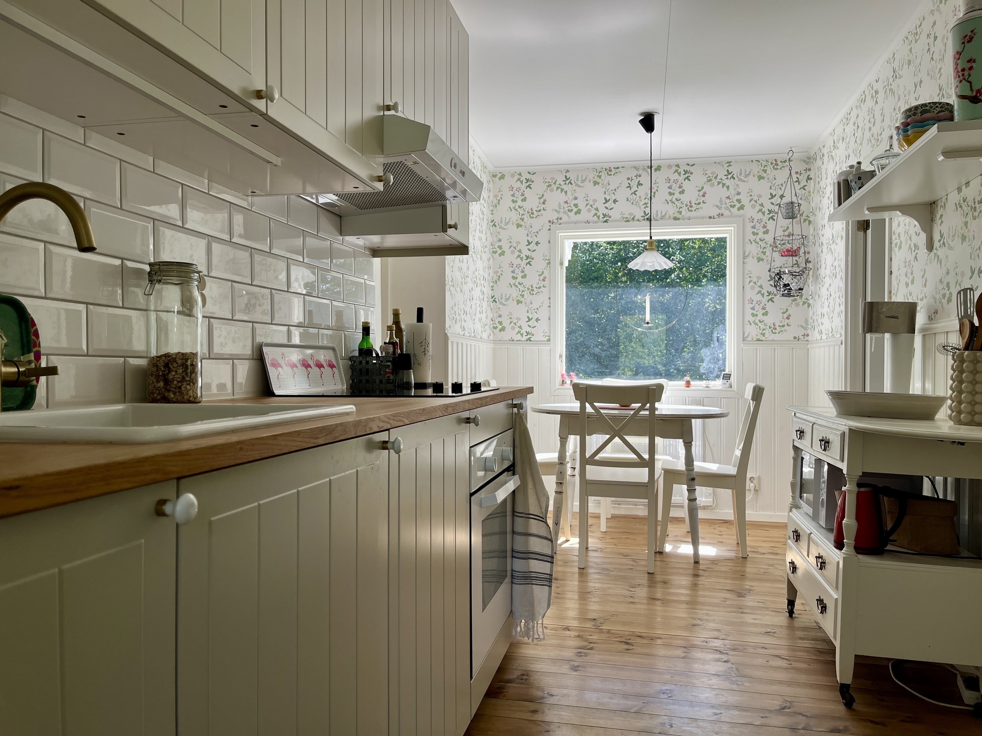 Entré Hall med praktisk kapphängare, laminatgolv. På utsidan till höger om entrén, finns ett mindre förråd med vv-beredare. Till vänster om entrén finns ett praktiskt vedförråd. Badrum Badrum med fönster, duschhörna, separett, tvättställ med spegelskåp ovan, samt förvaring under, stilren klinker på golvet. Kök Köket är utrustat med spishäll, ugn, fläkt, kombinerad kyl/frys. Bra förvaringsmöjligheter, och kakel ovan bänkskiva av ek. Matplats för fyra personer, vacker bröstpanel samt ett fint trägolv. Sovrum 1 Sovrum med en våningssäng, samt en vanlig säng, två garderober, laminatgolv. Sovrum 2 Sovrum med plats för dubbelsäng, två garderober, laminatgolv. Vardagsrum Stort vardagsrum som har ett fantastiskt ljusinsläpp, en trivsam braskamin med inbyggd fläkt, vackert trägolv, och utgång till den härliga altanen i söderläge. Renoveringar 2022- Målning och tapetsering i samtliga rum, samt utvändig ommålning av huset. Uppfört vedeldad bastu, badtunna med bubbelfunkiton, utedusch samt tillhörande trädäck vid bastu och badtunna. 2021- Nytt kök och nya vitvaror. Nytt furugolv (hårdvaxoljat) i köket och vardagsrummet. Badrummet har fått ny kommod, ny Separett (9000) samt våtrumsmålat väggar och tak, nytt klinkergolv. Ny varmvattenberedare. Solcellsstyrd lyktstolpe mellan husen.