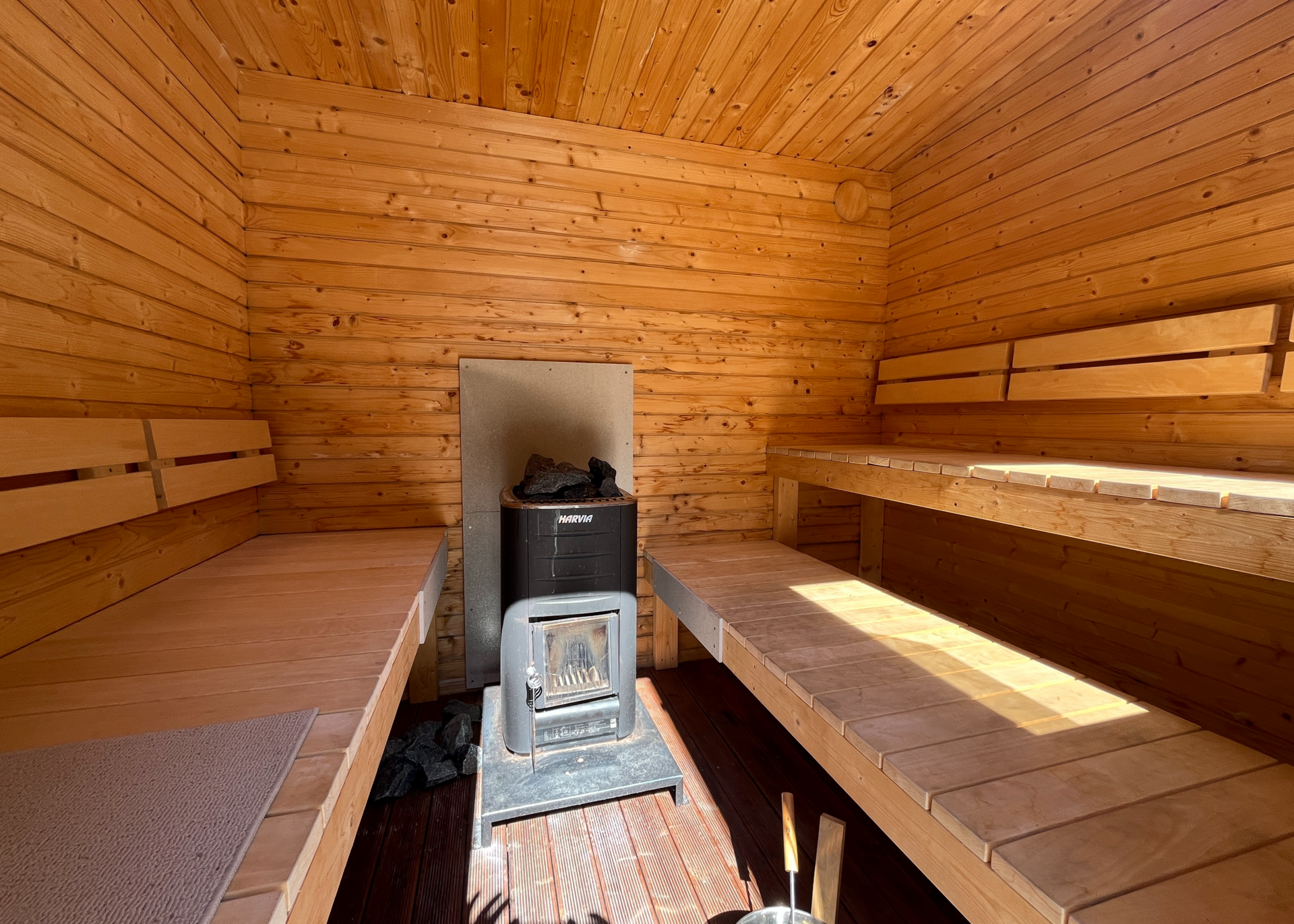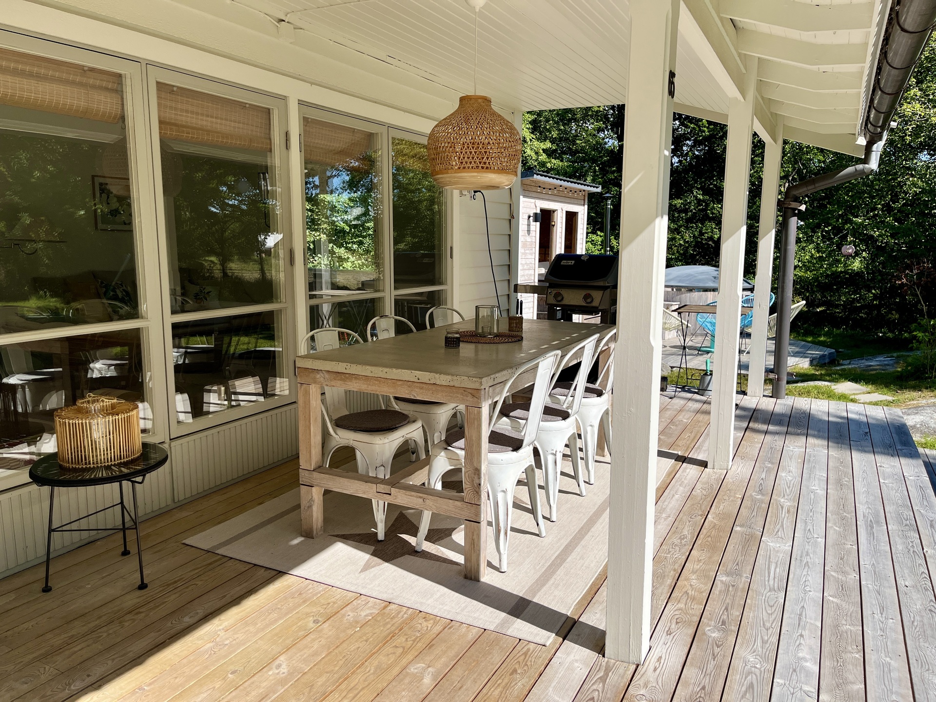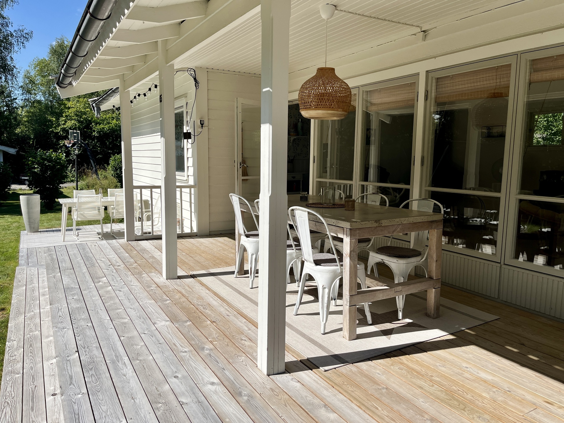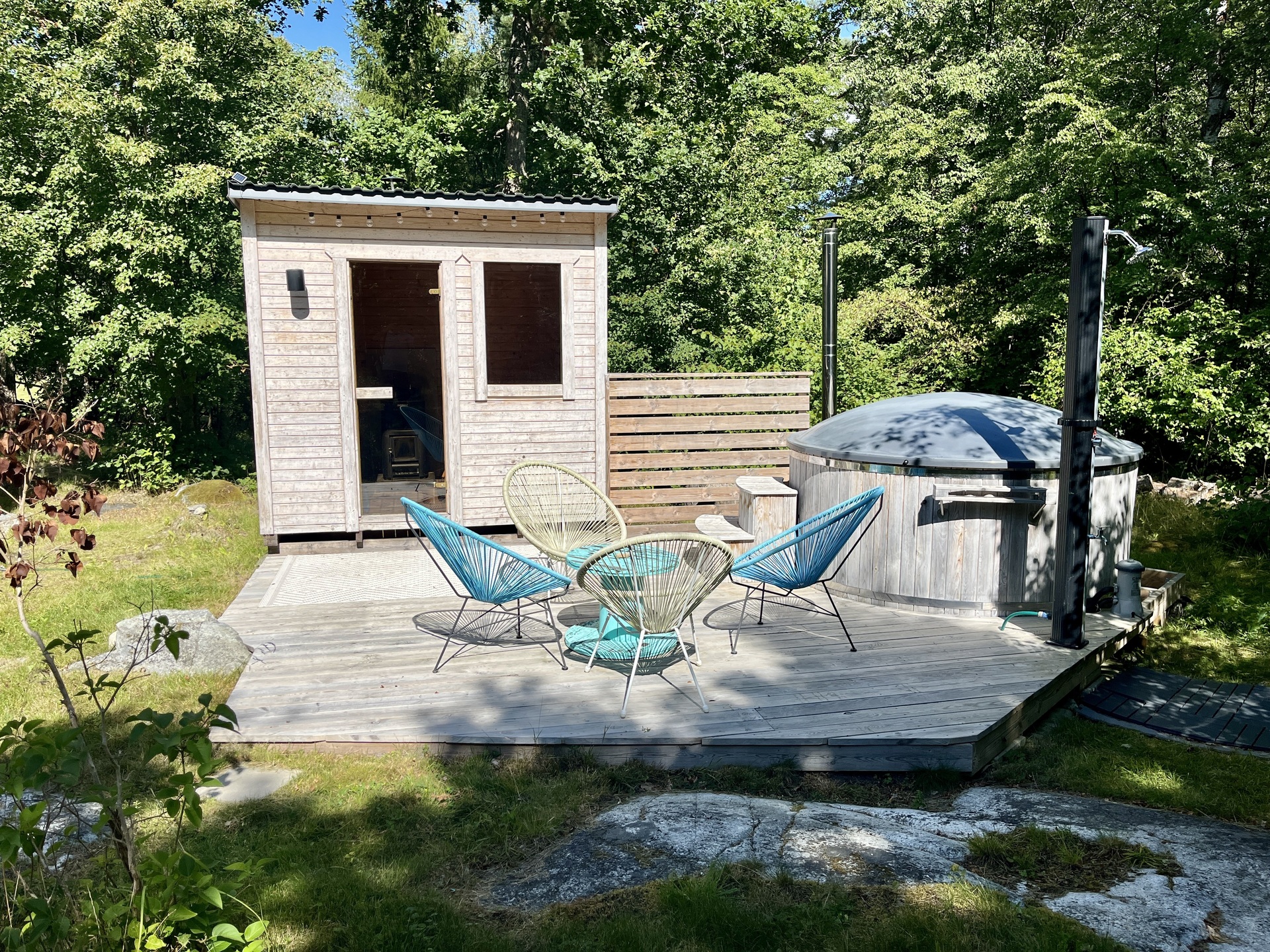 Fantastisk solig altan i söderläge, delvis under tak, i anslutning till en underbar vedeldad bastu, samt ett lika underbart vedeldat bubbelbad.